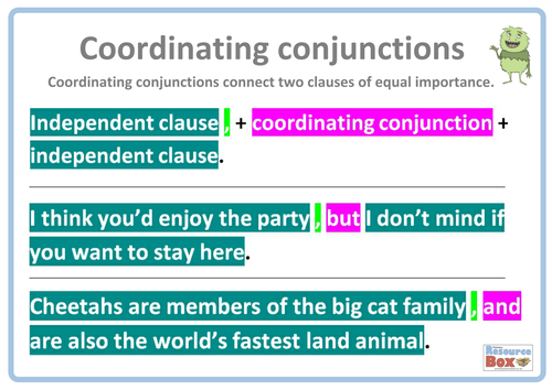 In grammar a conjunction abbreviated conj or cnj is a part of speech that connects words phrases or clauses that are called the conjuncts of the conjunctions. The coordinating conjunctions in english are for and nor but or yet and so many remember these with the mnemonic f a n b o y s. Coordinating conjunction also known as coordinators these conjunctions coordinate or join two or more sentences main clauses. Coordinating conjunctions always go between the words or phrases that they are connecting.