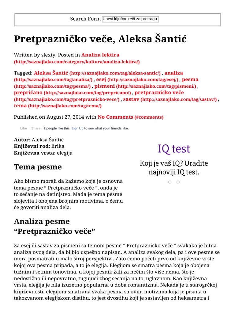 Pretpraznicko Vece Aleksa Santic Analiza Pesme Saznaj Lako