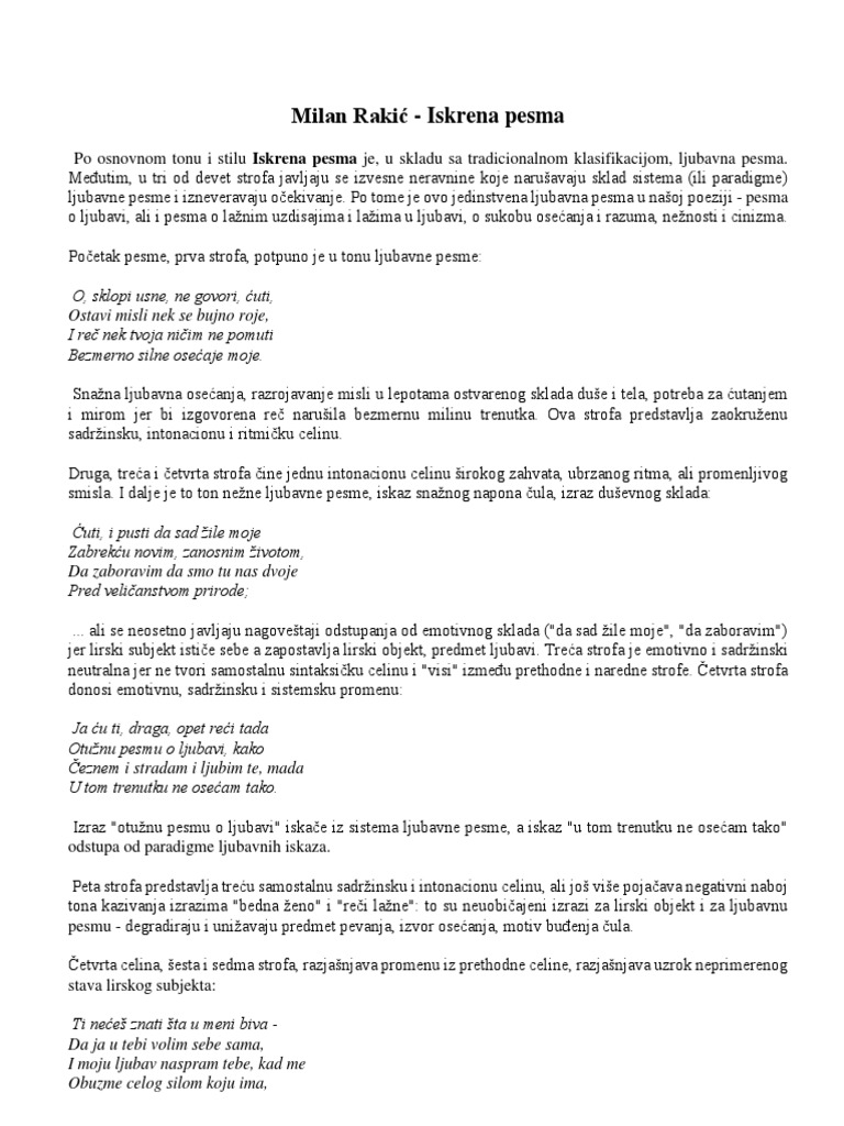 Analiza Pesme Iskrena Pesma Milan Rakic
