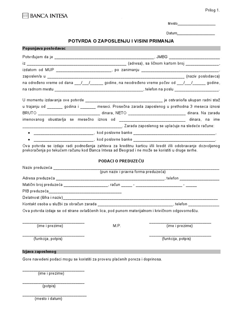 Potvrda O Zaposlenju I Visini Primanja Prilog 1