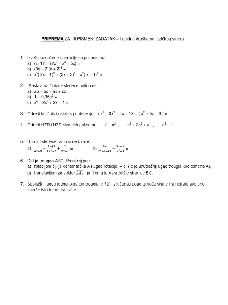 Pismeni Zadaci Iz Matematike Za 1 Razred Gimnazije
