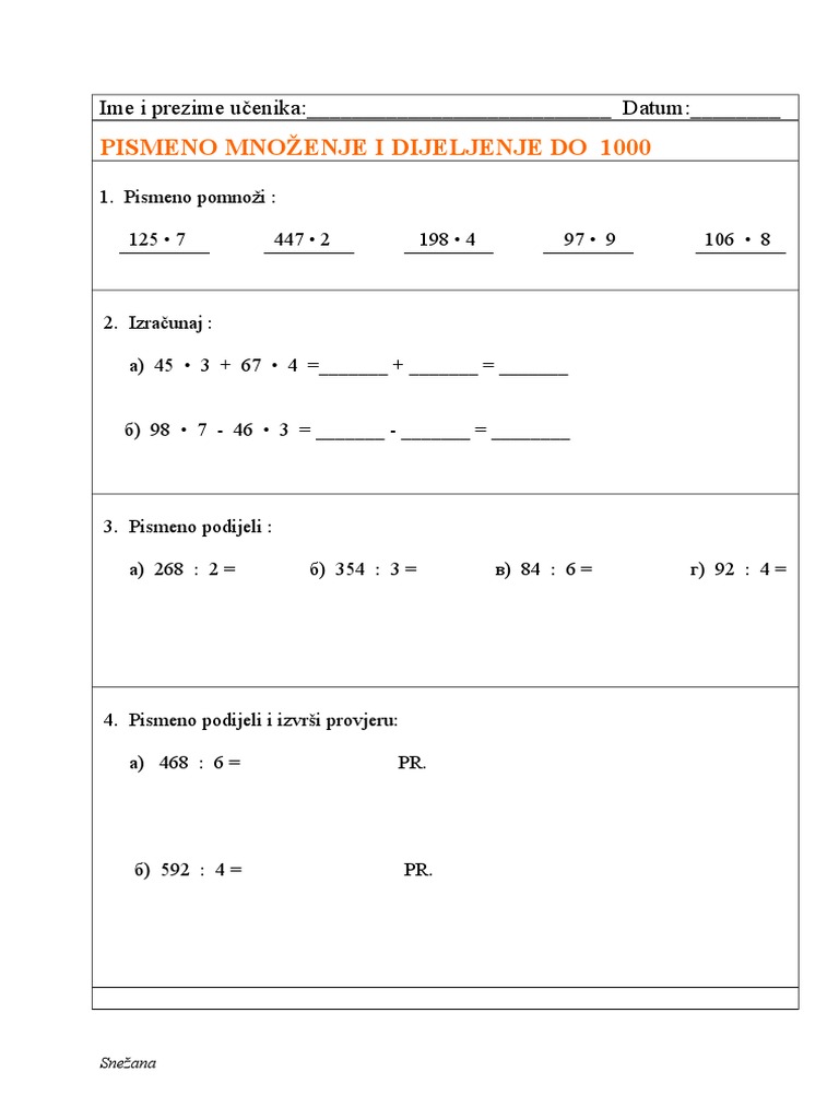 Pismeno Mnozenje I Deljenje Do 1000